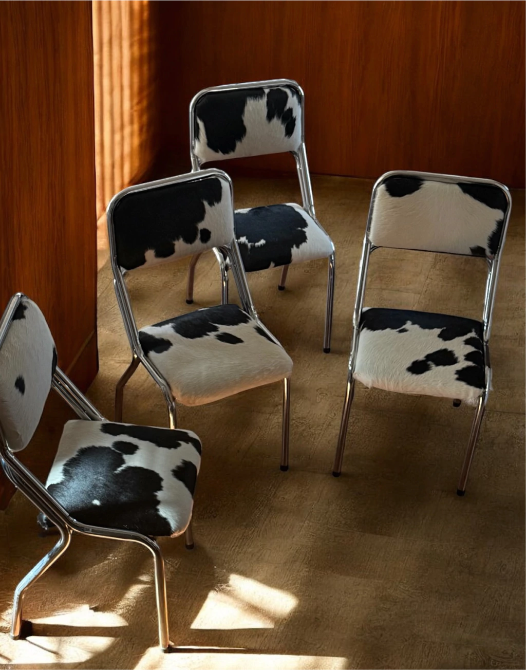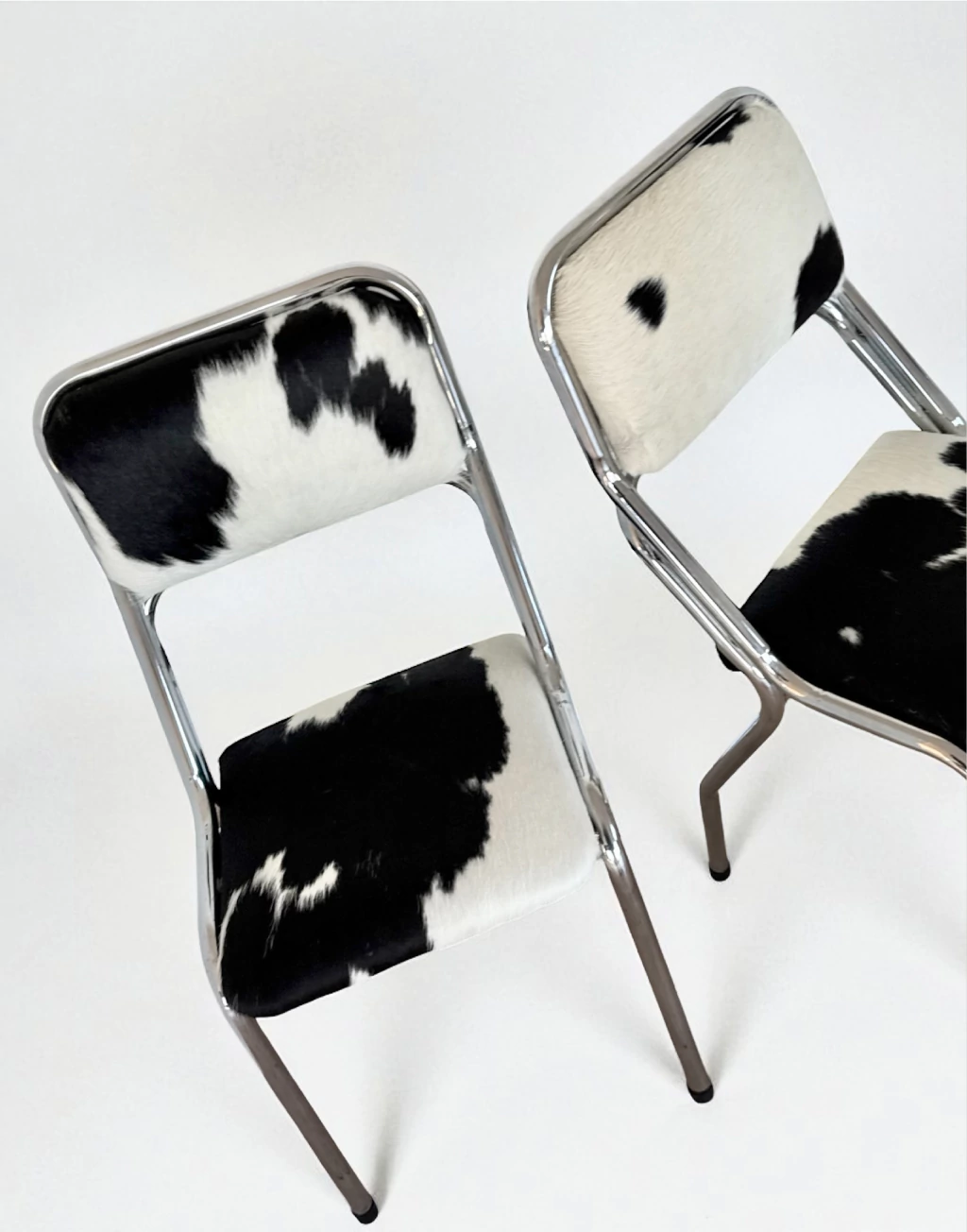 Compramos las sillas vintage y las restauramos a nuevo!. Las pulimos y mandamos a cromar. Sacamos su tapizado original y lo retapizamos con cuero vacuno de pelo blanco y negro. Cambiamos goma espuma y madera de asiento y respaldo. Para finalizar le compramos nuevos tapones para que no rayes el piso!